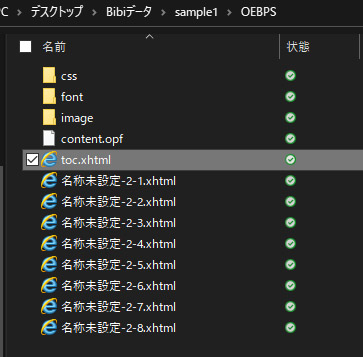 対象のファイルは各ブックデータのフォルダ内「OEBPS」の中にあります。
