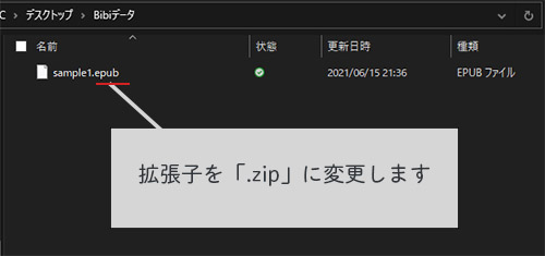 保存したファイルの場所を開いて、さっき保存した「.epub」ファイルの拡張子を「.zip」にします。