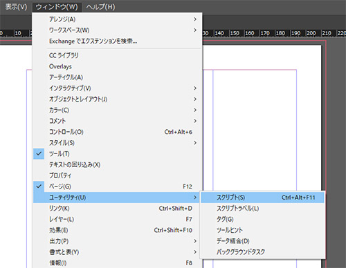 InDesignの「ウィンドウ」→「ユーティリティ」→「スクリプト」でスクリプトウィンドウを開きます。